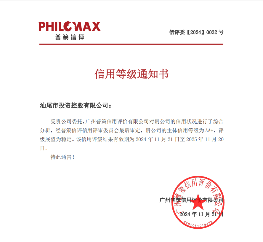 近日,經(jīng)廣州普策信用評(píng)價(jià)有限公司采用城市產(chǎn)業(yè)開(kāi)發(fā)運(yùn)營(yíng)企業(yè)評(píng)級(jí)模型綜合評(píng)定,汕尾市投資控股有限公司獲得主體信用AA+評(píng)級(jí),評(píng)級(jí)展望為穩(wěn)定,成為汕尾市首家獲得AA+信用評(píng)級(jí)的國(guó)有企業(yè)。 AA+主體信用評(píng)級(jí)是資本市場(chǎng)信用評(píng)級(jí)的重要分水嶺,也是國(guó)內(nèi)投資級(jí)和投機(jī)級(jí)的重要?jiǎng)澐謽?biāo)準(zhǔn)。此次獲得AA+主體信用評(píng)級(jí),既是資本市場(chǎng)對(duì)汕尾投控在市場(chǎng)競(jìng)爭(zhēng)力、運(yùn)營(yíng)能力和可持續(xù)發(fā)展能力等方面的認(rèn)可和肯定,也有利于提振汕尾資本市場(chǎng)形象,提升公司市場(chǎng)競(jìng)爭(zhēng)力和影響力,為加快實(shí)現(xiàn)公司高質(zhì)量發(fā)展提供更大規(guī)模、更多渠道、更低成本的資金支持。 展望未來(lái),公司將進(jìn)一步聚焦市委市政府重點(diǎn)工作部署和“4+X”主業(yè)主責(zé)、“5+1+N”業(yè)務(wù)板塊,充分發(fā)揮AA+主體信用評(píng)級(jí)優(yōu)勢(shì),牢牢把握市場(chǎng)機(jī)遇,不斷拓展融資渠道、降低融資成本、壯大資產(chǎn)規(guī)模,持續(xù)增強(qiáng)核心功能、提升核心競(jìng)爭(zhēng)力,全力打造“值得信賴(lài)的現(xiàn)代國(guó)企集團(tuán)”,為推動(dòng)汕尾經(jīng)濟(jì)社會(huì)高質(zhì)量發(fā)展貢獻(xiàn)更大力量。
